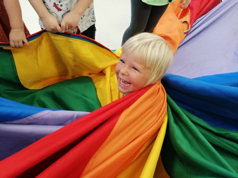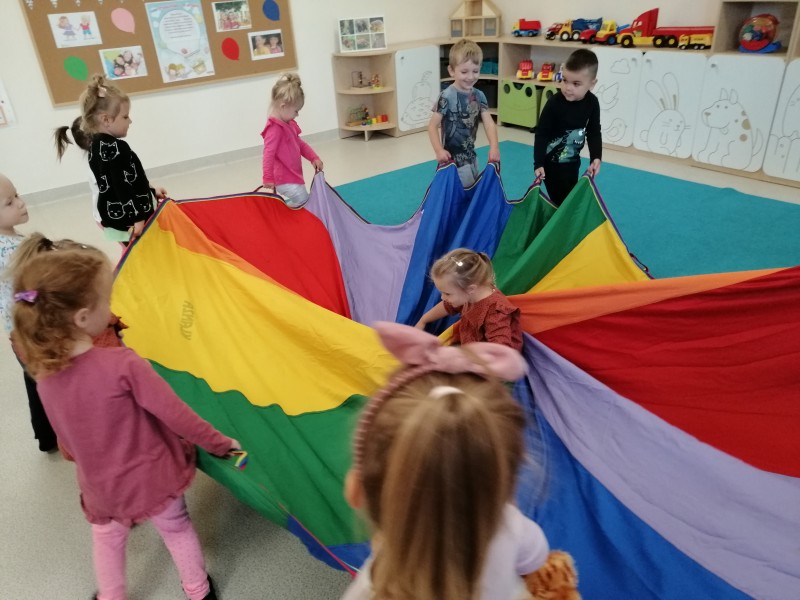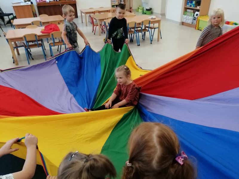 Stasiu W., Julka, Matylda i Maja odwaĹźyli siÄ usiaĹÄ na chuĹcie. W tym czasie Bratki zakrÄciĹy chustÄ wokóĹ nich. Dzieciom bardzo podobaĹa siÄ zabawa!