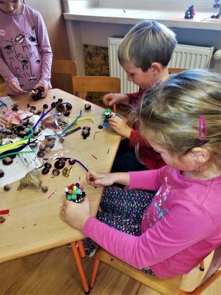 Do zabaw materiaĹem przyrodniczych zainspirowaĹa nas Marysia, ktĂłra przyniosĹa caĹy worek kasztanĂłw, ĹźoĹÄdzi, patyczkĂłw...I od razu zaczÄĹa siÄ twĂłrcza zabawa. .Wyobraznia dziecka jest nieograniczona, a codzienne, podejmowane zabawy jeszcze bardziej przyczyniajÄ siÄ do jej rozwoju i zachwycajÄ dorosĹych.