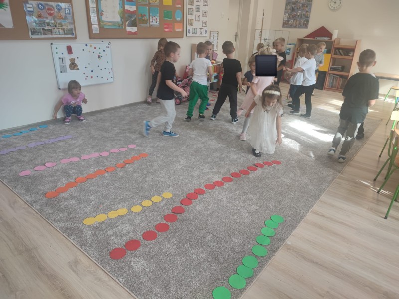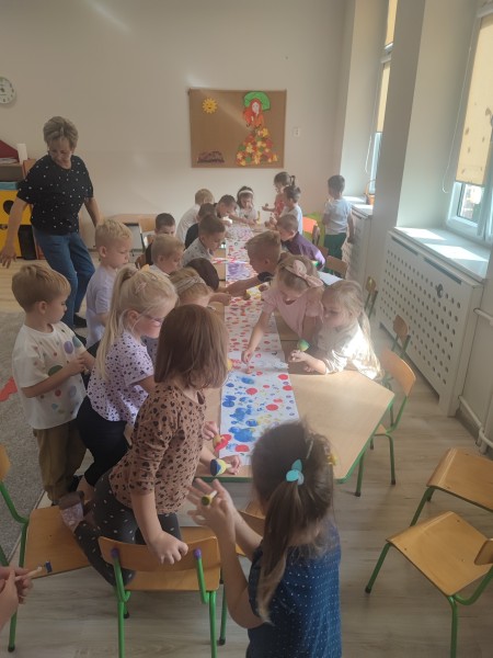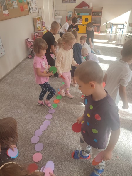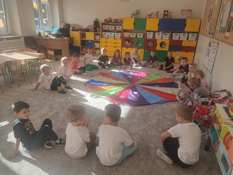 WspĂłlnie bawiliĹmy siÄ z chustÄ animacyjnÄ , a nastÄpnie wykonaliĹmy pracÄ plastycznÄ pt. „Kropkowy dywan”. ByĹ to dzieĹ peĹen radoĹci, kolorĂłw i pomysĹowoĹci.