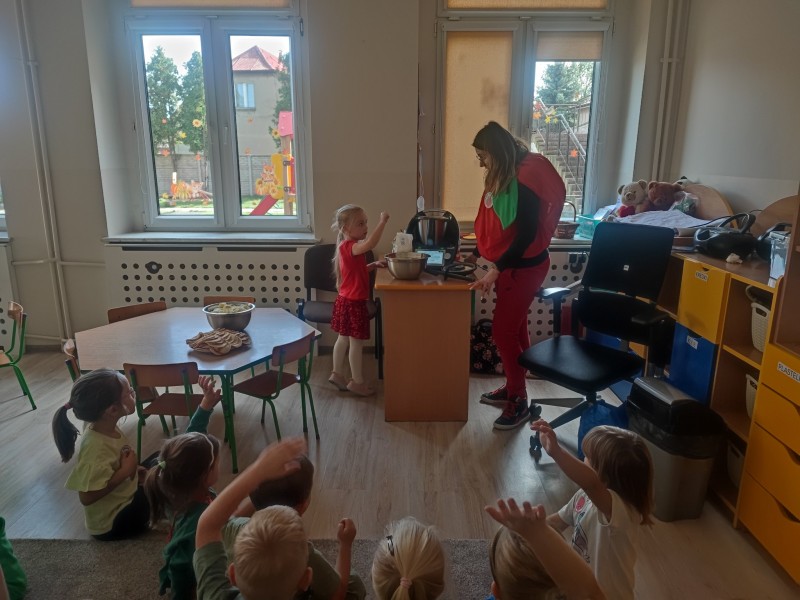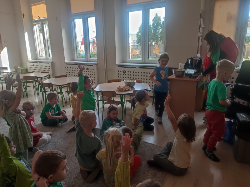 NastÄpnie grupa FioĹki przygotowywaĹa pyszny mus jabĹkowy w thermomiksie. KaĹźde dziecko mogĹo dorzuciÄ potrzebne skĹadniki i zobaczyÄ, jak powstaje zdrowy deser. Na zakoĹczenie wszyscy z apetytem zajadali naleĹniki z musem jabĹkowym.