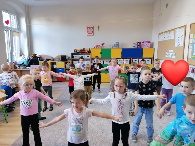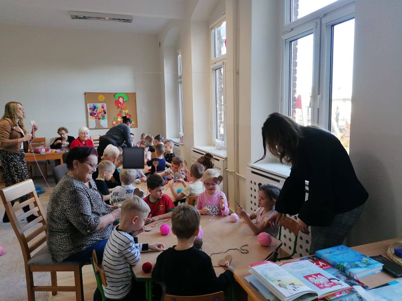 Dzieci z grupy FioĹki wspĂłlnie z goĹÄmi przygotowywaĹy upominki na DzieĹ Babci i Dziadka – kolorowe serduszka na patyczku ozdobione weĹnÄ
