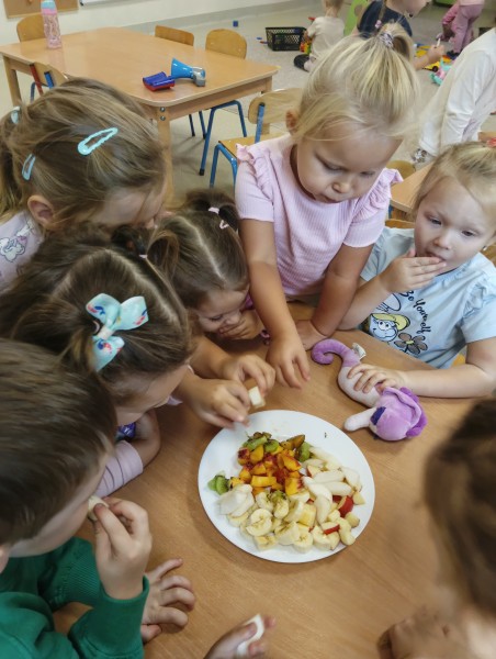 Podczas zajÄÄ Stokrotki zaglÄ daĹy wewnÄ trz owocĂłw. SprawdzaliĹmy co w Ĺrodku znajdziemy, a nastÄpnie chÄtne dzieci prĂłbowaĹy smaki owocĂłw.